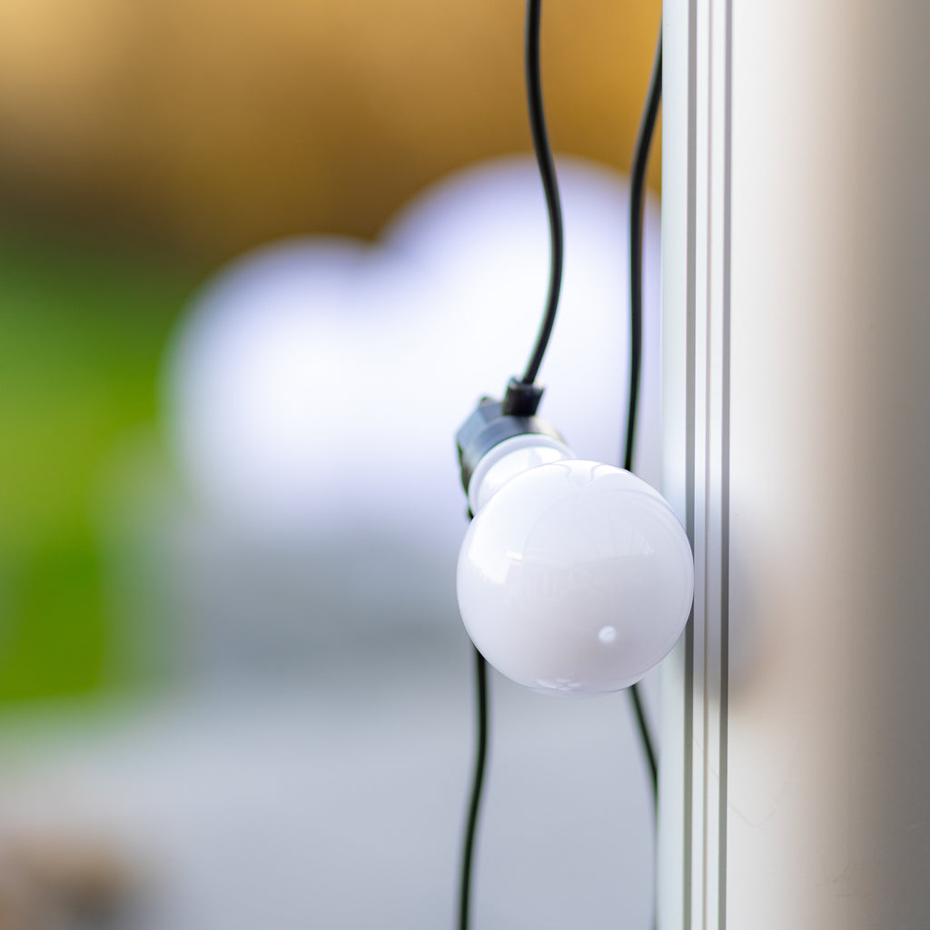 Denna dekorativa Lea LED-ljuskedja består av en 5 meter lång svart sladd med 10 stora glödlampor. Paketet innehåller också en adapter för ett eluttag. Det är möjligt att använda detta Lea "startkit" som det är eller så kan du förlänga det med "Lea förlängningskit"