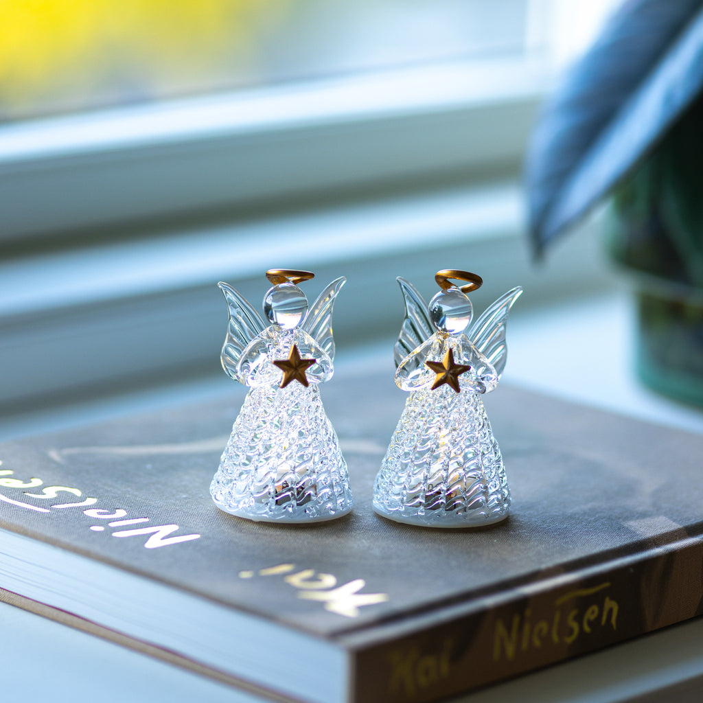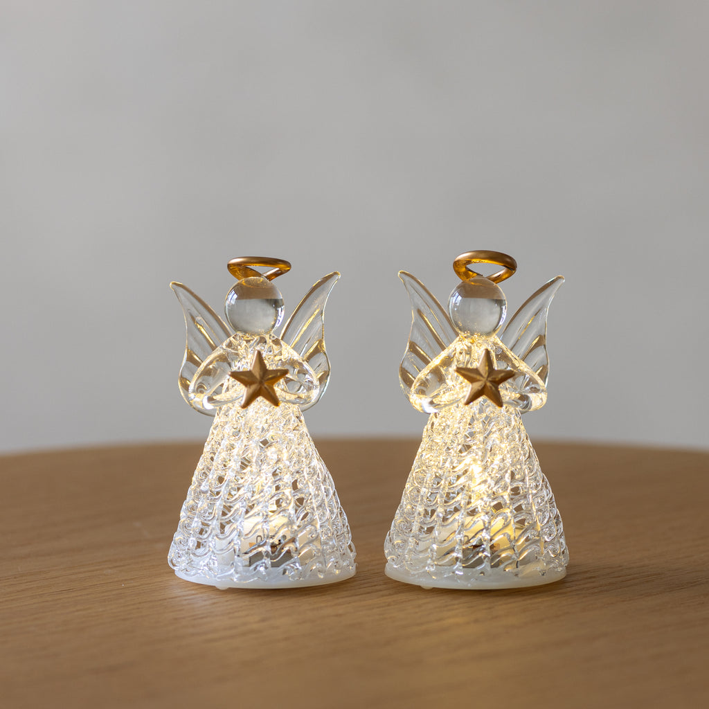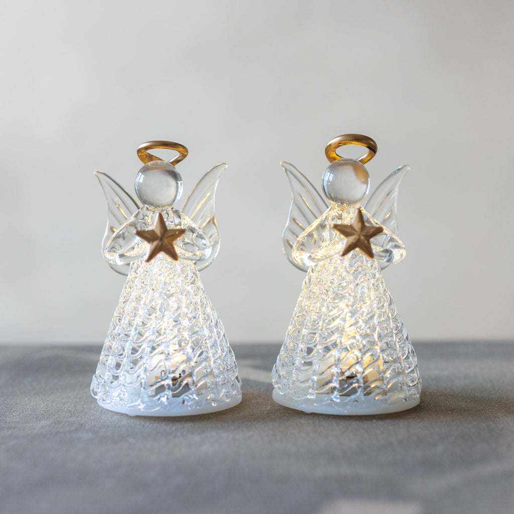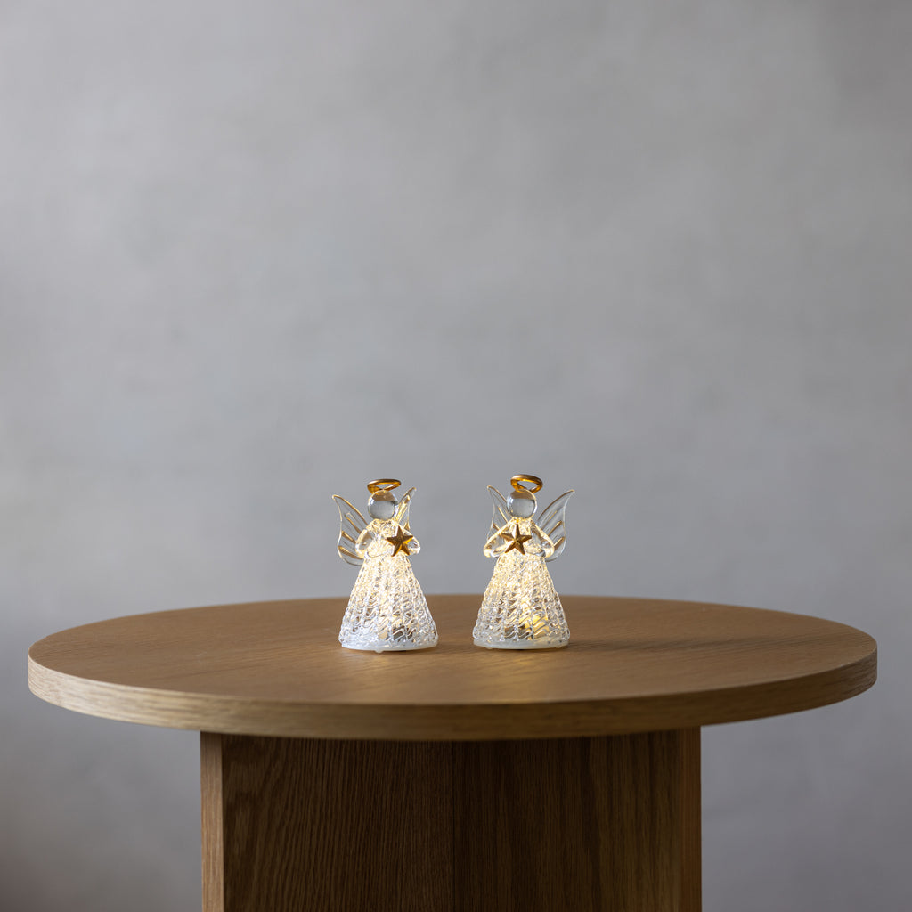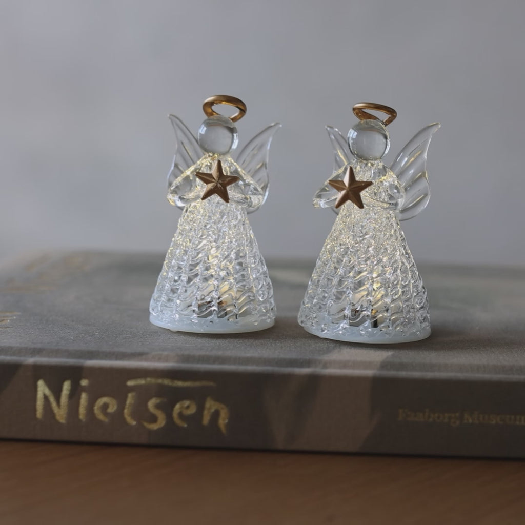 Med våra Luca-änglar får du 2 vackra och eleganta änglar tillverkade i glas. Båda änglarna håller en gyllene stjärna och bär en gyllene gloria. Änglarna ger en vacker glöd för dig att njuta av under julen. Låt dem lysa upp ditt hem och njut av den mysiga, stämningsskapande belysningen tillsammans med vänner och familj