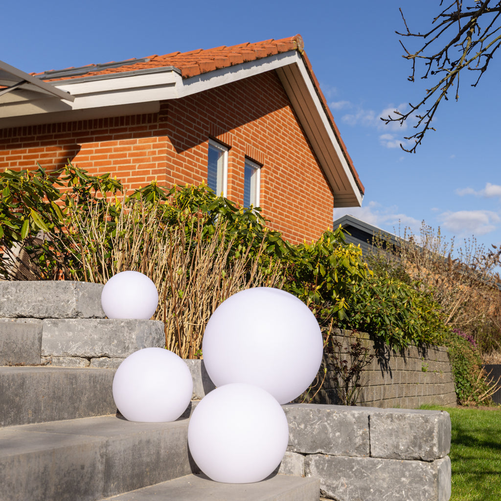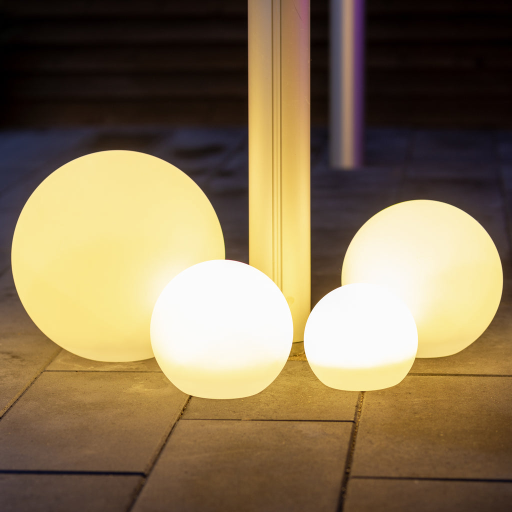 Diese eleganten IDA LED-Lichtkugeln passen perfekt in jeden Garten oder auf jeden Balkon. Das Licht schaltet sich automatisch in der Dämmerung ein. Dieses Set enthält 4 Größen.