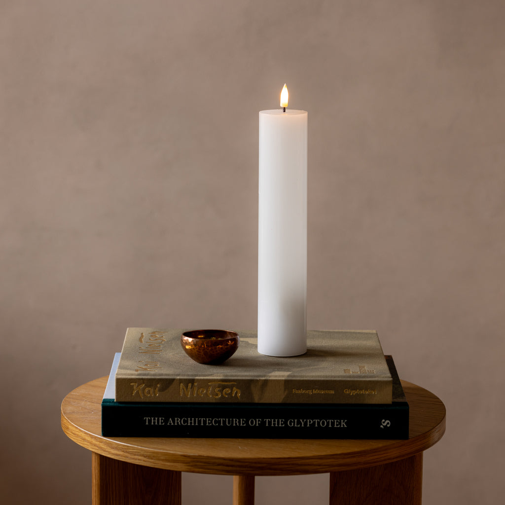 This white Luca LED pillar candle is an elegant battery-operated candle that provides authentic and cosy lighting. The block candle has a diameter of 4.8 centimetres, which fits perfectly with Piet Hein floor candle holders.